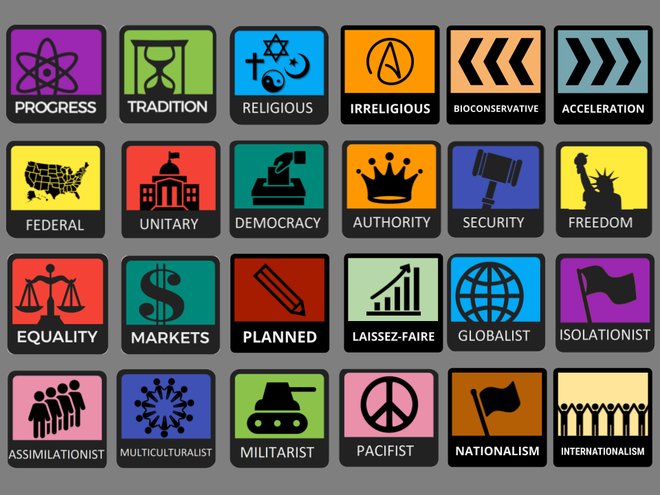 There are eleven independent axes, where each has two opposing values assigned to them, each grouped into a category. They are: